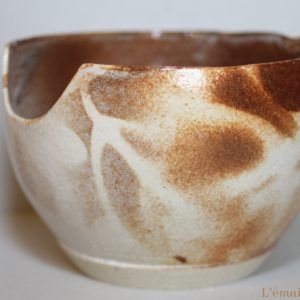 Ce bol ramequin marron bleu est en grès, de taille moyenne à grande . J’aime beaucoup les effets rendus par l’émaillage entre le bleu et le marron. Et il a aussi de jolis effets à l’intérieur. Très agréable en main.
